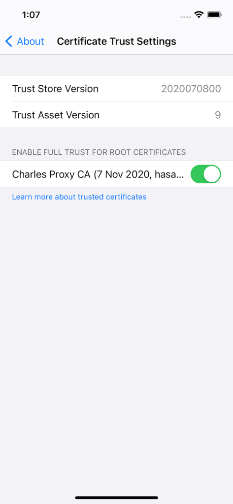 3- Check if Charles Proxy CA certificate is turned on in simulator Settings -> General -> About -> Certificate Trust Settings