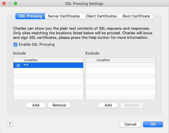 4- Enable SSL Proxying. At Charles, go to menu Proxy -> SSL Proxying Settings. Add new location with host * and port set to * as. shown below: