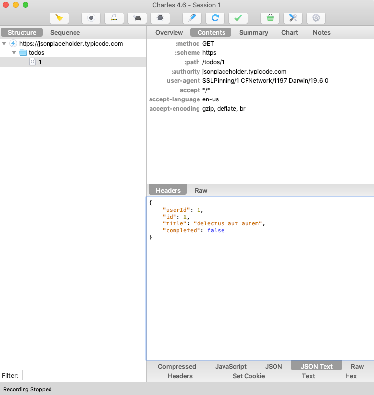 Now that we have setup Charles. I have a basic app which makes a request to https://jsonplaceholder.typicode.com/todos/1 . Without SSL Pinning, I can trace my call at Charles when I run my application: